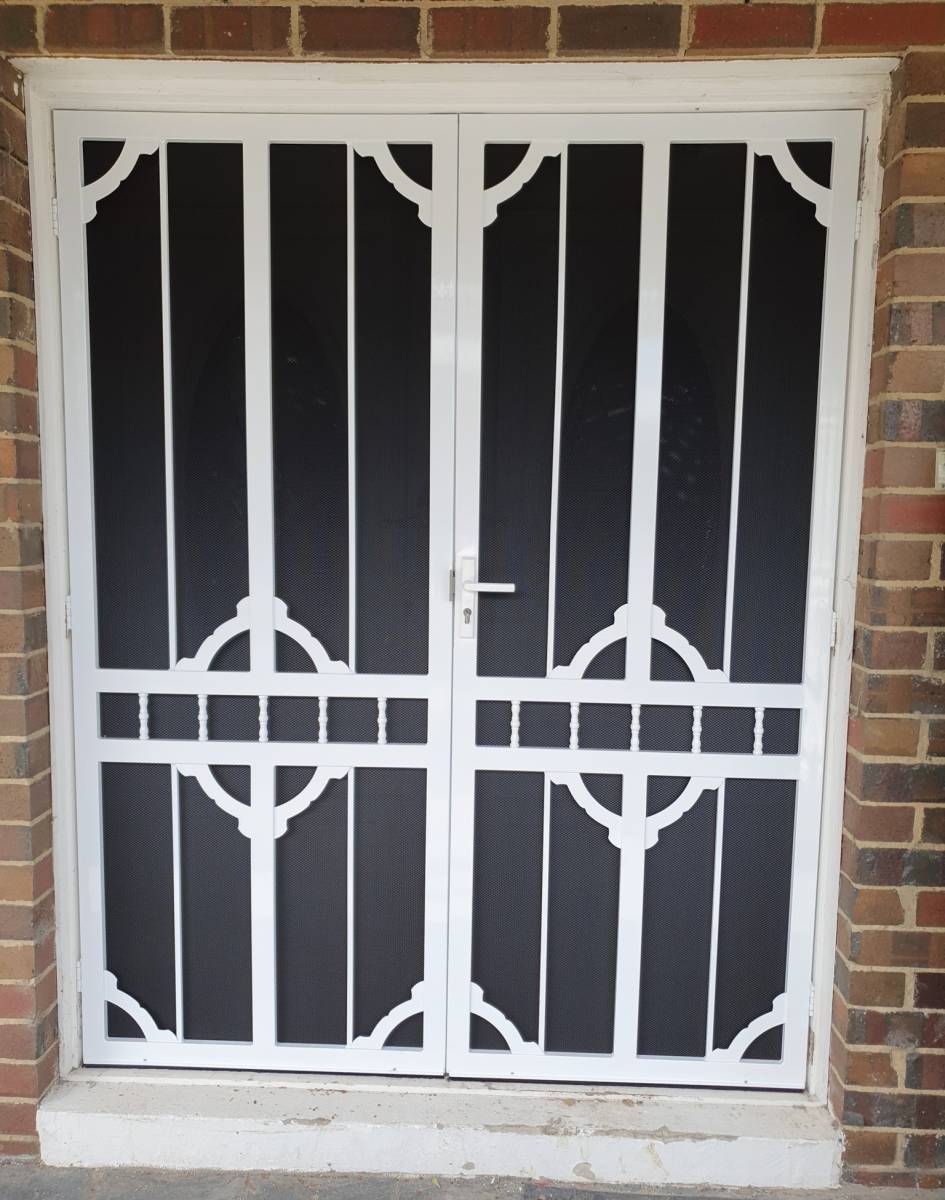CB: 63 Clear Breeze Steel Double Doors Daylesford 1/SB With Hi Strength Privacy Black Mesh In White.